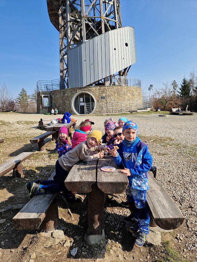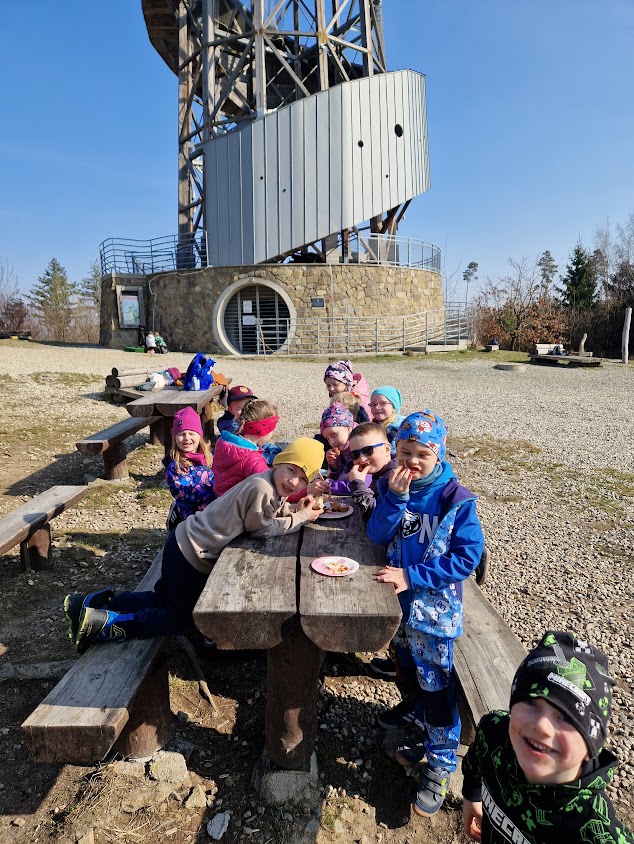 Ve středu 11.3. jsme se třídou Motýlků vyšli na výlet do přírody - na náš krásný Kosíř. U rozhledny si děti opekly špekáčky.