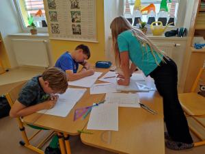 Hodiny geometrie se věnujeme také skupinové práci a řešení problémů, kdy žáci musí společnými silami rozluštit složitý geometrický zápis a podle něj vše přesně narýsovat.