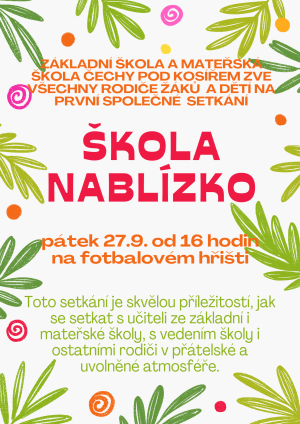 Vážení rodiče, srdečně Vás zveme na první komunitní setkání "ŠKOLA NABLÍZKO", které se koná v pátek 27.9. od 16 hodin na fotbalovém hřišti v Čechách pod Kosířem pro rodiče dětí ze základní a mateřské školy.