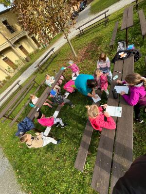 Nejprve si prvňáci v zámeckém parku posbírali kaštany. V hodinách i o přestávkách je budeme využívat k zábavnému vyučování jako např. skládání nového písmenka E.