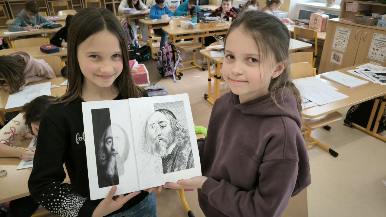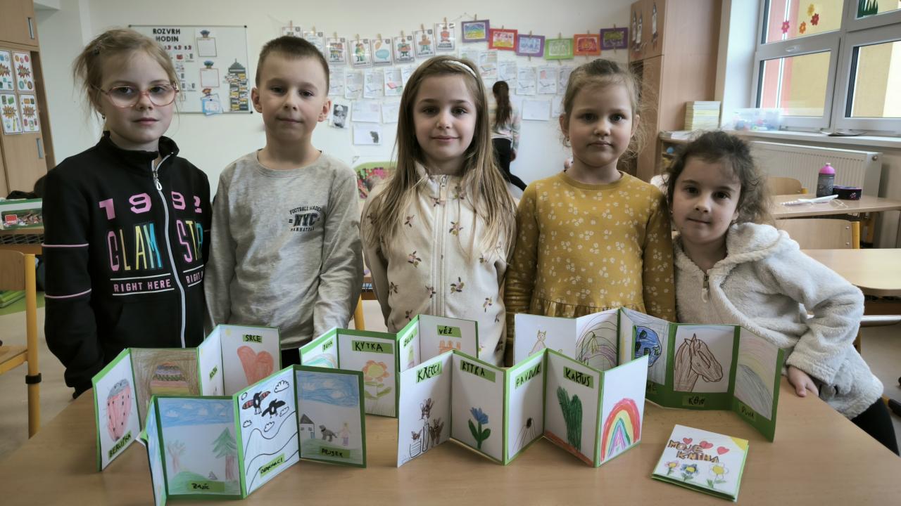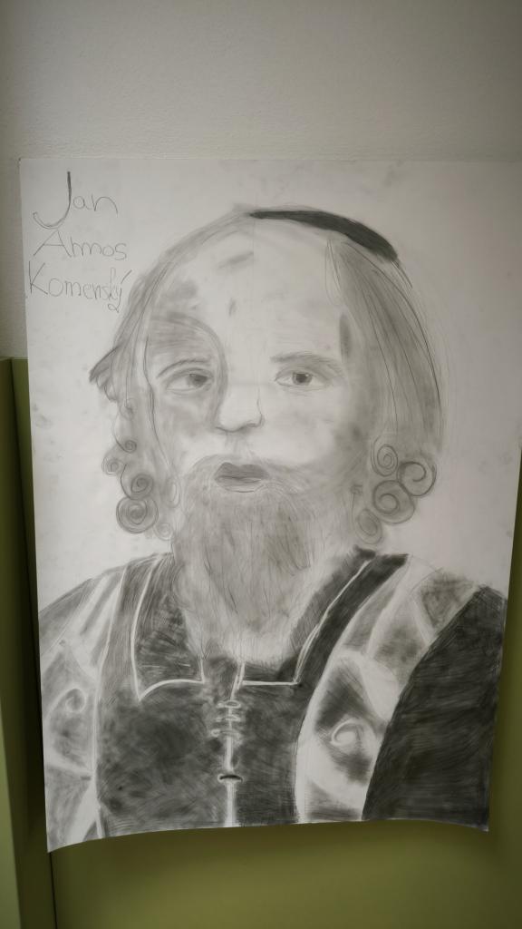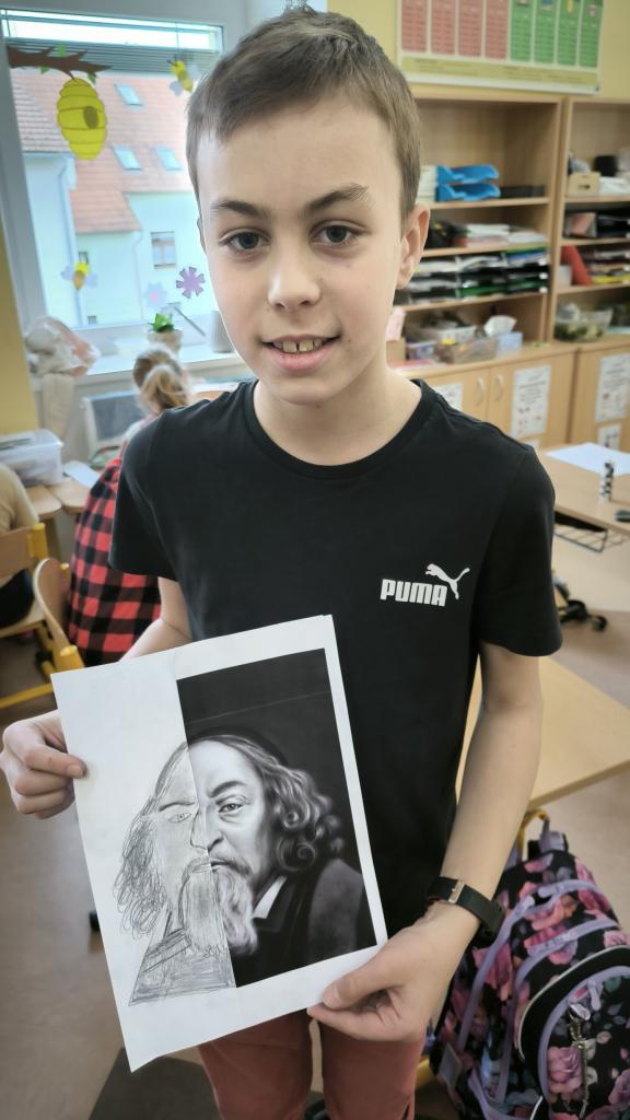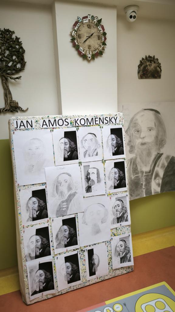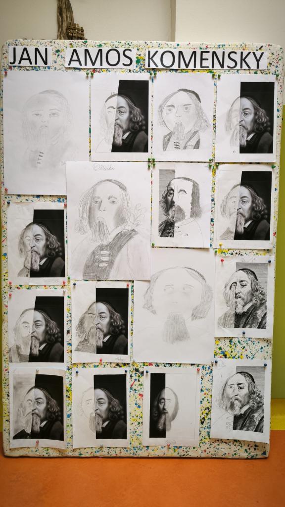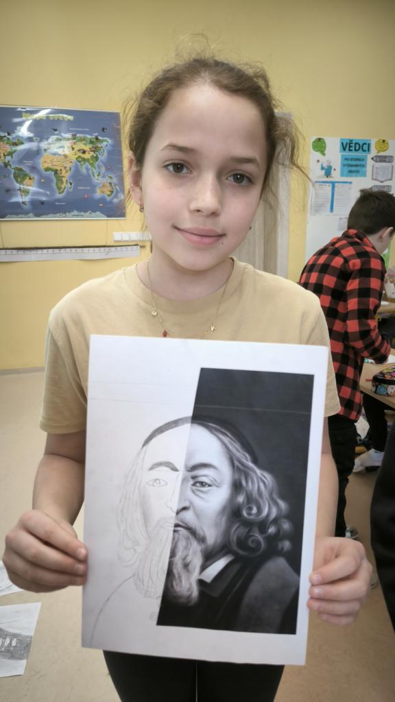 Ve výtvarné výchově jsme se se staršími žáky snažili zachytit jeho portrét tužkou, s žáky prvního a druhého ročníku jsme tvořili obrázkové leporelo. Dětem se v tvoření opravdu dařilo.