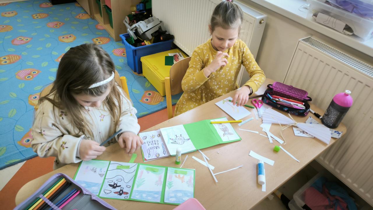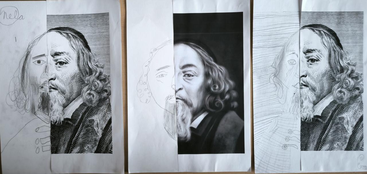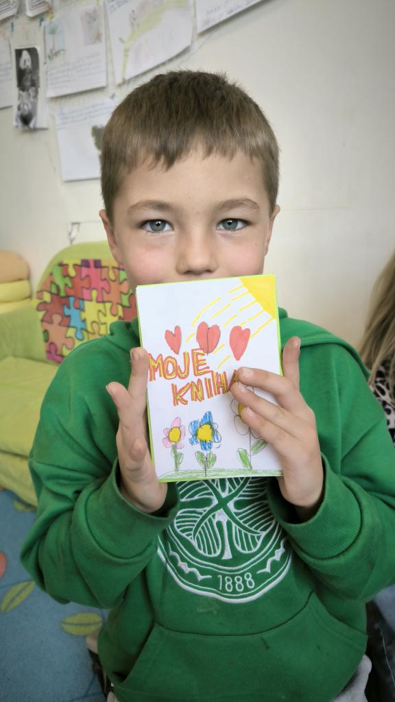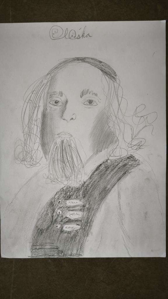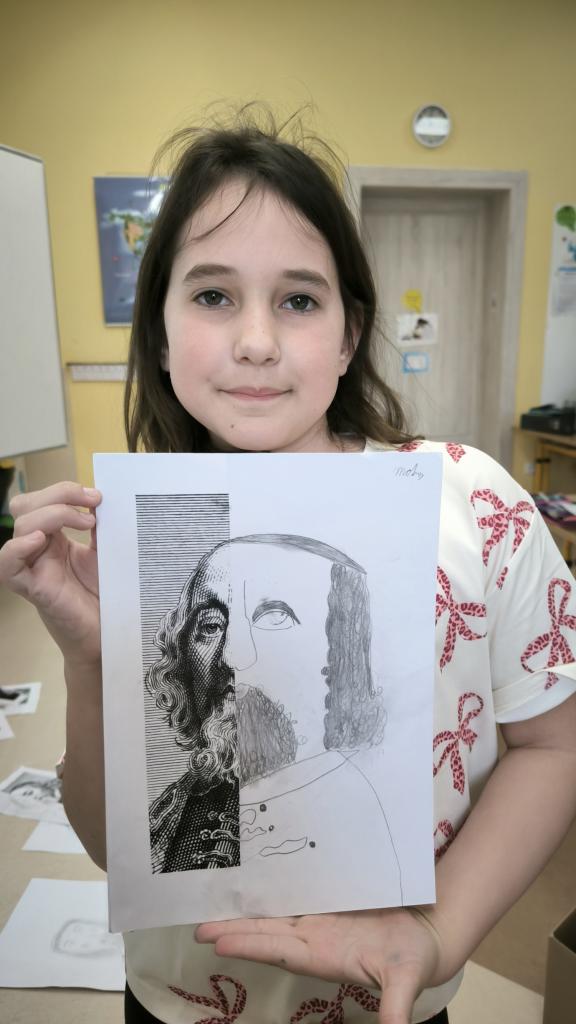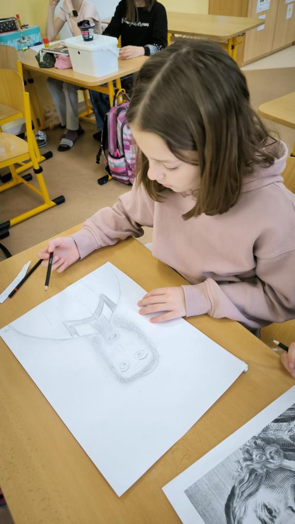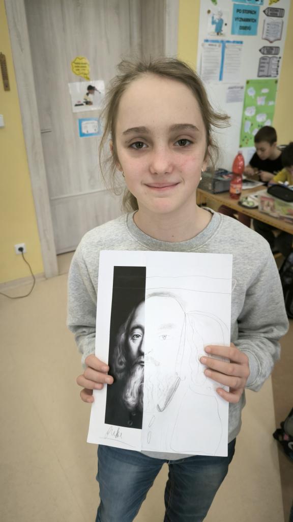 Ve výtvarné výchově jsme se se staršími žáky snažili zachytit jeho portrét tužkou, s žáky prvního a druhého ročníku jsme tvořili obrázkové leporelo. Dětem se v tvoření opravdu dařilo.