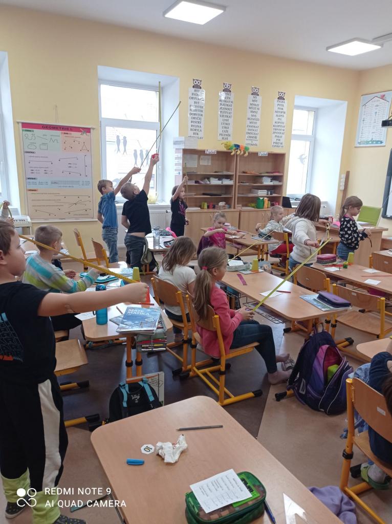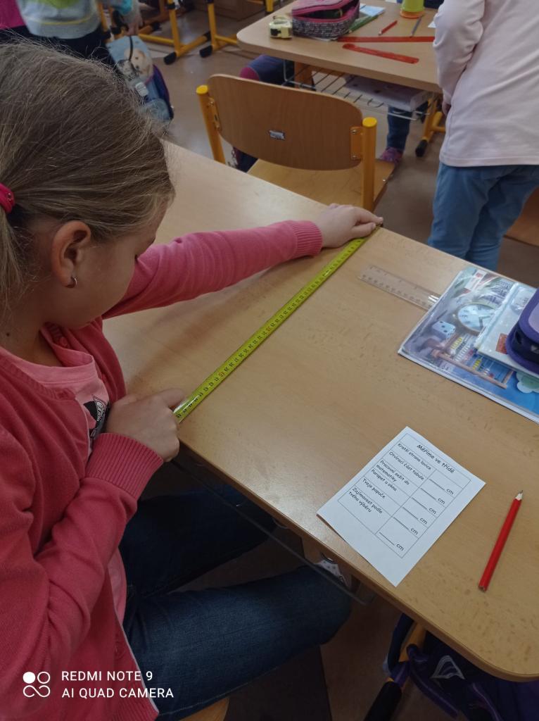 V rámci geometrie si žáci 2. a 3. ročníku vyzkoušeli, jak se správně měří. Cílem bylo změřit přesně délku různých předmětů ve třídě. Každý žák si donesl vlastní metr a s chutí se pustil do práce. Při měření se žáci naučili základní jednotky délky, jak je převádět a správně zapsat do tabulky. Hodina byla podle hodnocení žáků velmi zdařilá.