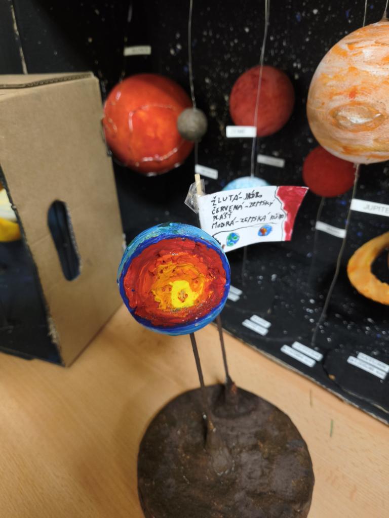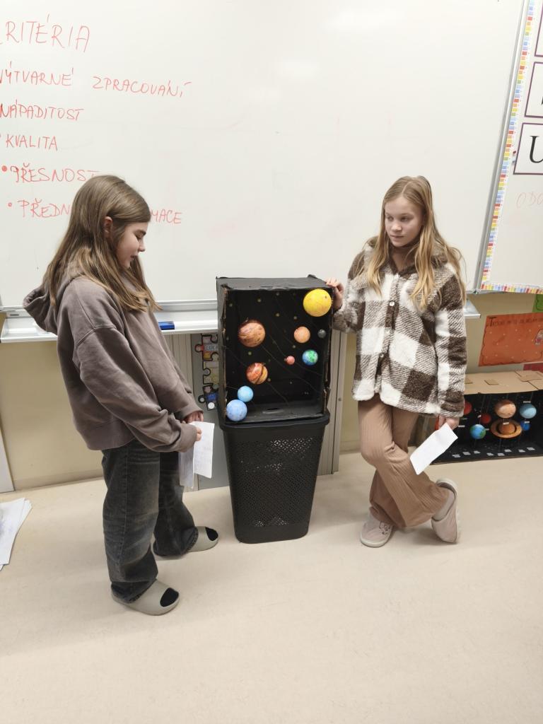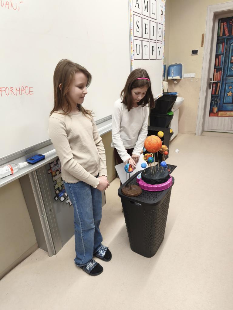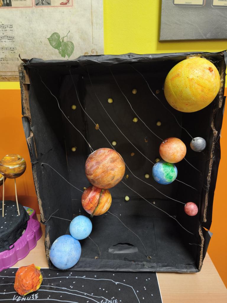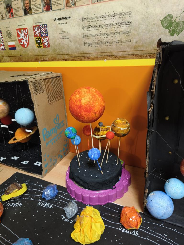 Žáci 5. ročníku se v rámci projektu Vesmír zapojili do tvorby modelů Sluneční soustavy. Práce byla realizována nejen během hodin přírodovědy, ale také ve volném čase doma. Každý žák představil svůj originální výtvor, což přispělo k rozvoji jejich kreativních dovedností a znalostí o vesmíru. Prezentace zahrnovala nejen samotné modely, ale také důležité informace o planetách a dalších tělesech Sluneční soustavy.