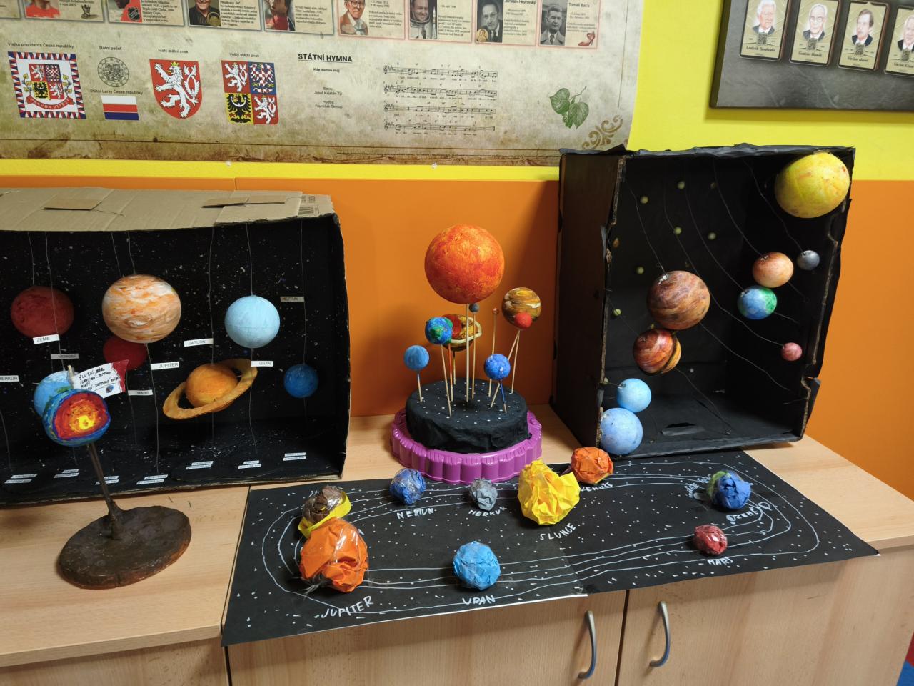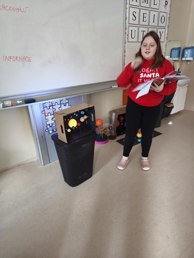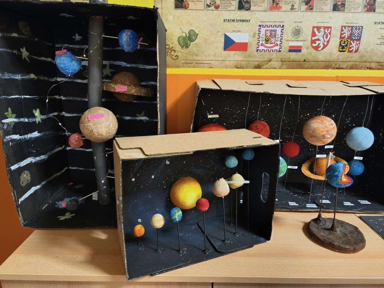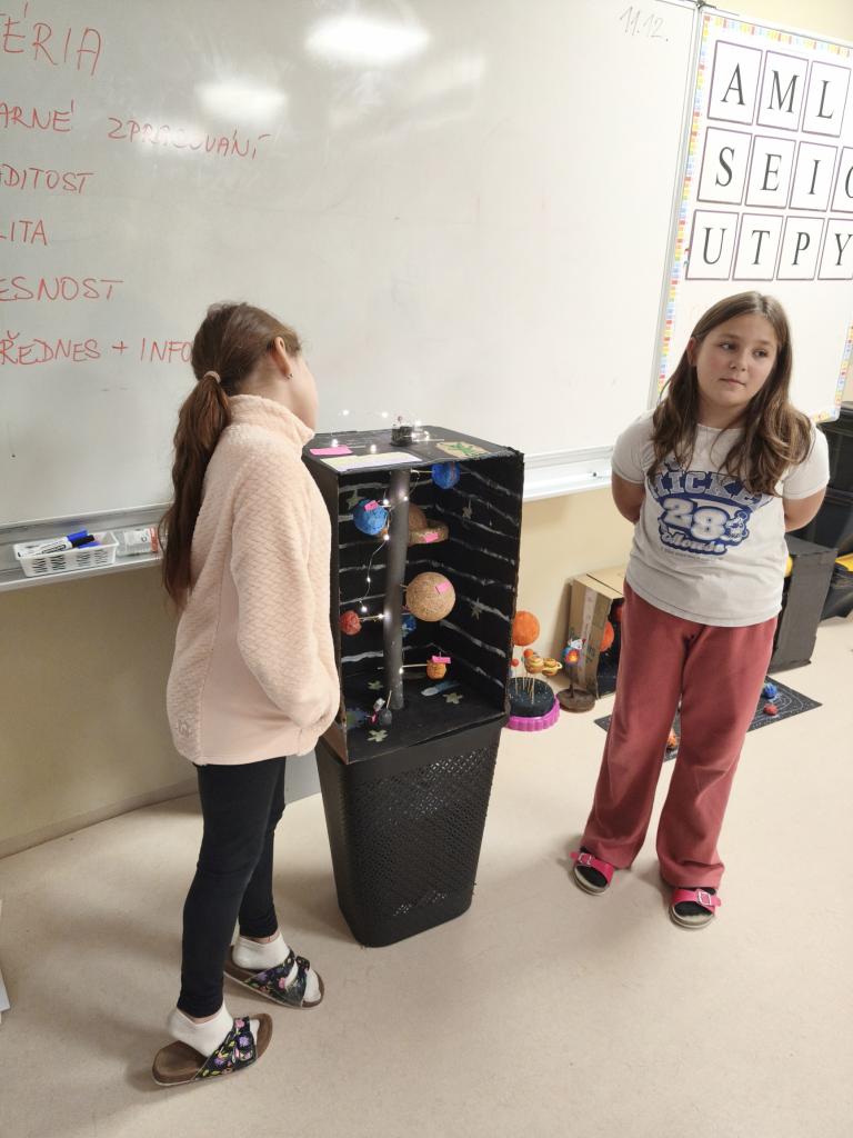 Žáci 5. ročníku se v rámci projektu Vesmír zapojili do tvorby modelů Sluneční soustavy. Práce byla realizována nejen během hodin přírodovědy, ale také ve volném čase doma. Každý žák představil svůj originální výtvor, což přispělo k rozvoji jejich kreativních dovedností a znalostí o vesmíru. Prezentace zahrnovala nejen samotné modely, ale také důležité informace o planetách a dalších tělesech Sluneční soustavy.