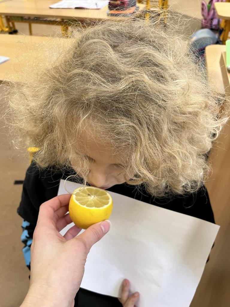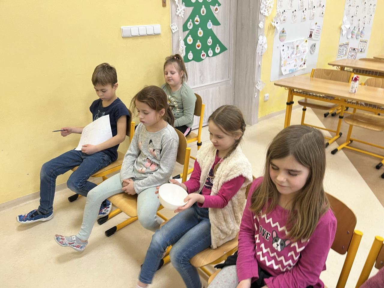 V hodině prvouky jsme s žáky testovali své smyly. Nejprve jsme začali chutí, kde žáci ochutnávali různé potraviny a museli je poznat. Dále si otestovali čich a hmat. Poté za pomocí poslechu různých frekvencí zjistili stáří svého sluchu. Nakonec potrénovali svůj zrak, kdy hledali ukrytá čísla v různých pozadích.