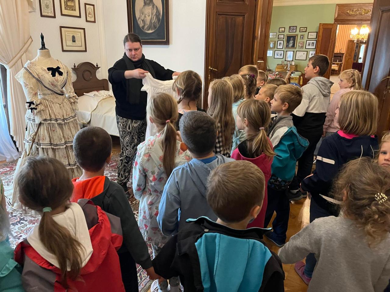 Zámek Čechy pod Kosířem, zde nás čekala komentovaná prohlídka zámeckých interiérů. Zámek je úzce spojen s rodinou Silva-Tarouca a s významným malířem Josefem Mánesem, který zde často pobýval. Děti si s velkým zájmem prohlížely malované stropy, historický nábytek a umělecké sbírky, které ilustrují život šlechty v 19. století. Průvodci se jim také věnovali vyprávěním o zámeckých legendách a zajímavostech, které zaujaly nejen malé, ale i větší žáky.