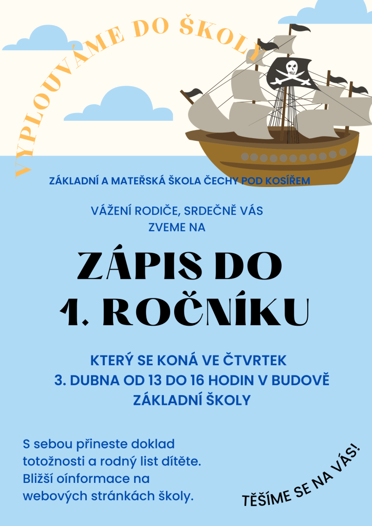 Zápis do 1. ročníku se uskuteční ve čtvrtek 3.4. od 13 do 16 hodin v budově ZŠ.