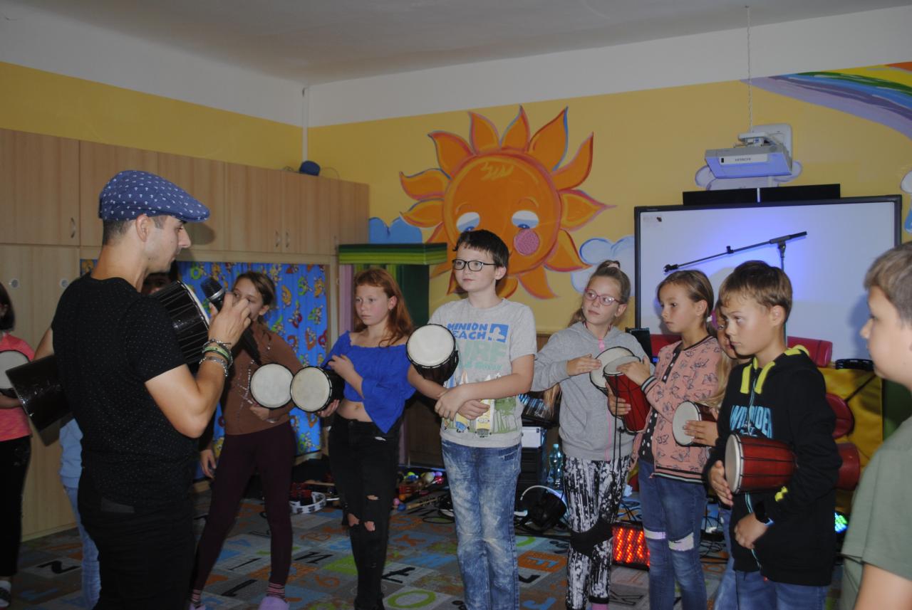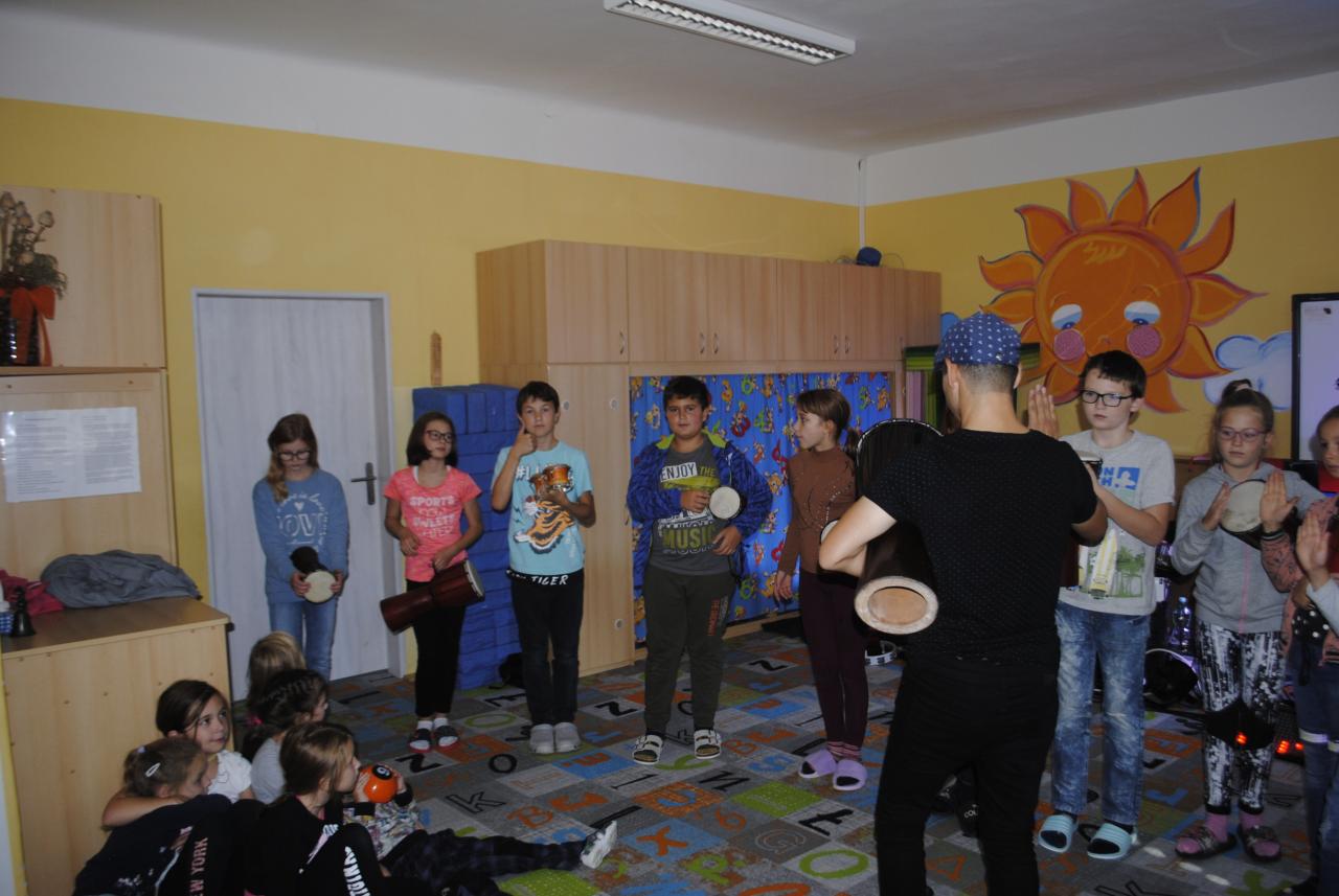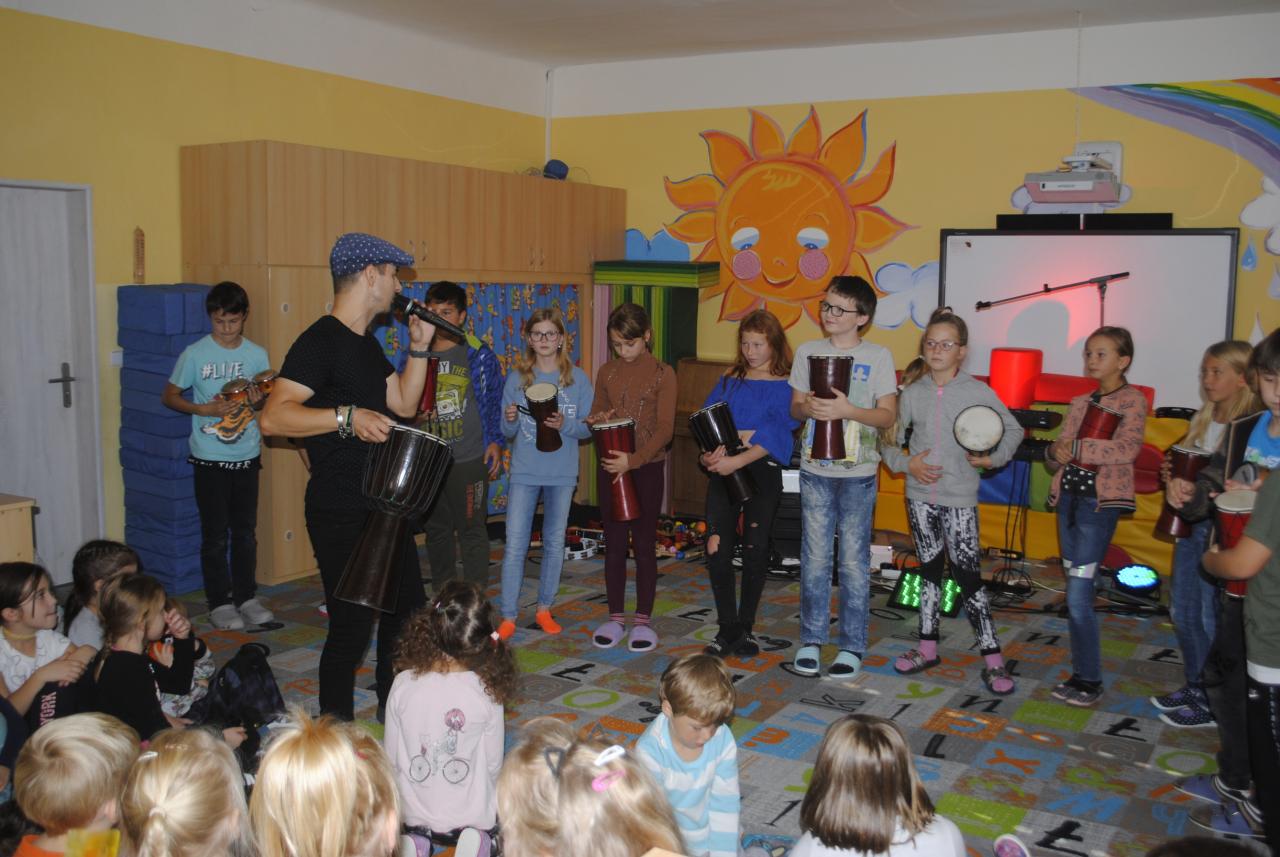 Žáci měli možnost si vyzkoušet spoustu rytmických nástrojů, včetně afrických bubnů. Budeme se těšit na další návtěvu příští rok, kdy nás pan Toman překvapí novými efekty.